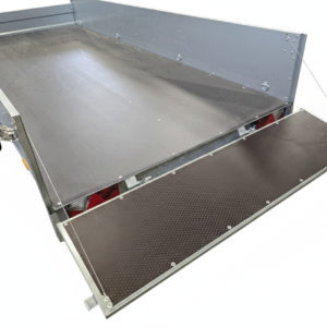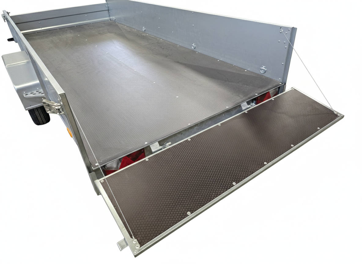 Lehtijouset + iskunvaimentimet, kaasujouselle varustettu kippi, saranoidut päätylaidat, nokkapyörä, sisä- ja ulkopuoliset sidontalenkit ja koukut, vesitiiviit akselinnavat, LED- etuvalot, takalaita vaneroitu ajosillaksi, takalaidan vaijeripidin.
